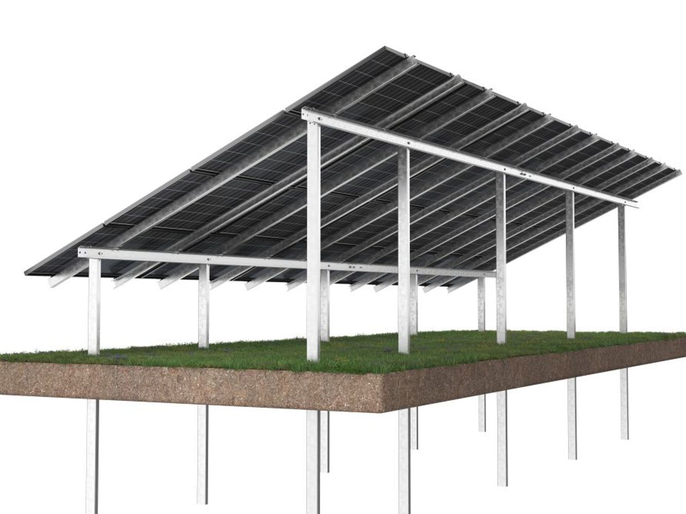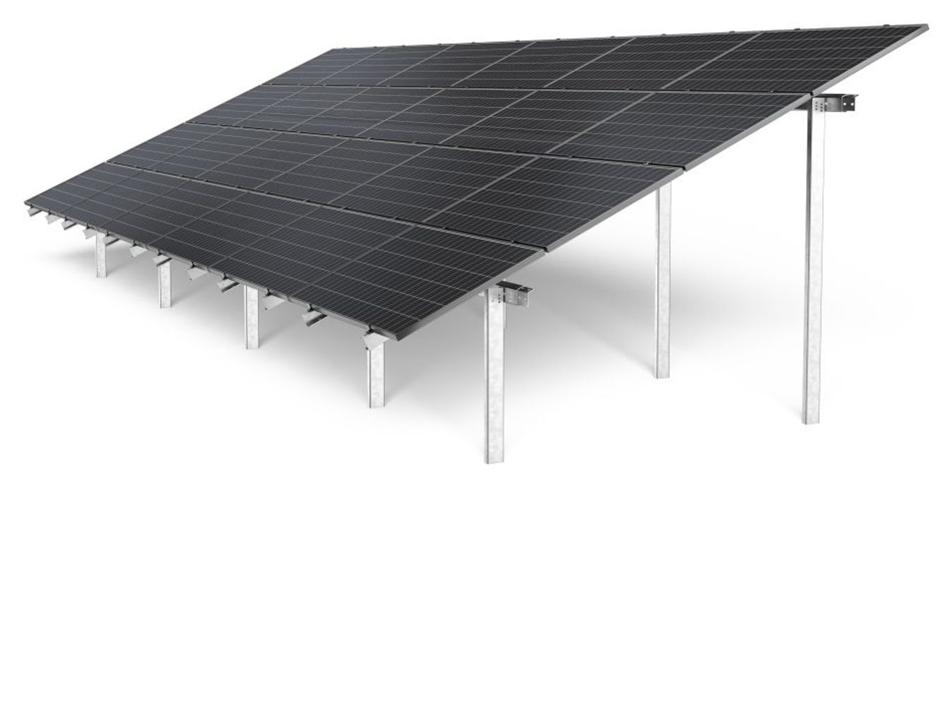 Corab WS-007-systemet er en dobbeltstøttekonstruktion dedikeret til store landbrugsprojekter. Det vil også fungere godt hjemme i haven, hvor du kan stikke ben ned med en pæledriver. Systemet er lavet af korrosionsbestandigt Magnelis, hvilket giver mulighed for op til 25 års anti-korrosionsbelægningsgaranti. Moduler installeres vandret i 4 rækker. Hældningsvinklen er 25 grader.